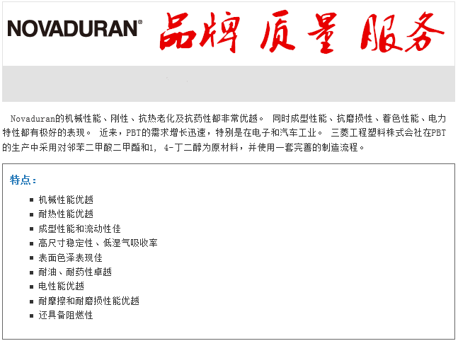 日本三菱NOVADURAN系列PBT树脂的机械性能、刚性、抗热老化及抗化学性都非常好, 同时成型性能、抗磨损性、着色性能、电力特性都有极好的表现。