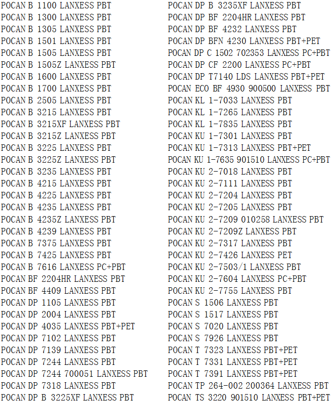 德国朗盛POCAN系列PBT聚对苯二甲酸丁二醇酯 你要找的型号就在下面: