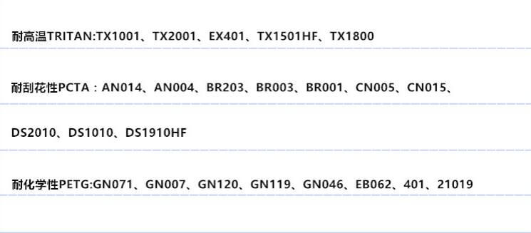 伊斯曼化学EASTAR系列PETG共聚多酯原料 你要找的型号就在下面:(请用Ctrl+F键查找牌号更快捷)