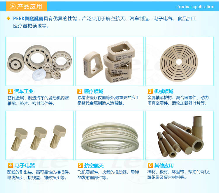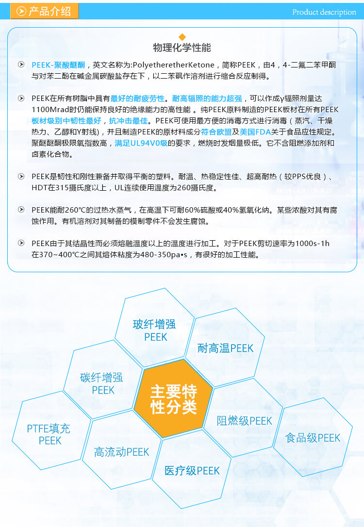 产品名称:聚醚醚酮(PEEK)树脂是一种性能优异的特种工程塑料,与其他特种工程塑料相比具有更多显著优势,耐正高温260度、机械性能优异、自润滑性好、耐化学品腐蚀、阻燃、耐剥离性、耐磨性、不耐强硝酸、浓硫酸、抗辐射、超强的机械性能可用于高端的机械、核工程和航空等科技。