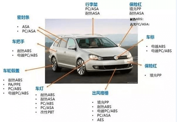 汽车用塑料包括:改性PP、PA6、PA66、ABS、PA/ABS、PC/ABS、ASA、PC/PBT、PET/PBT、MPPO等,广泛应用于汽车保险杠、仪表板、内、外饰件、发动机周边、空调系统、车灯等部件。
