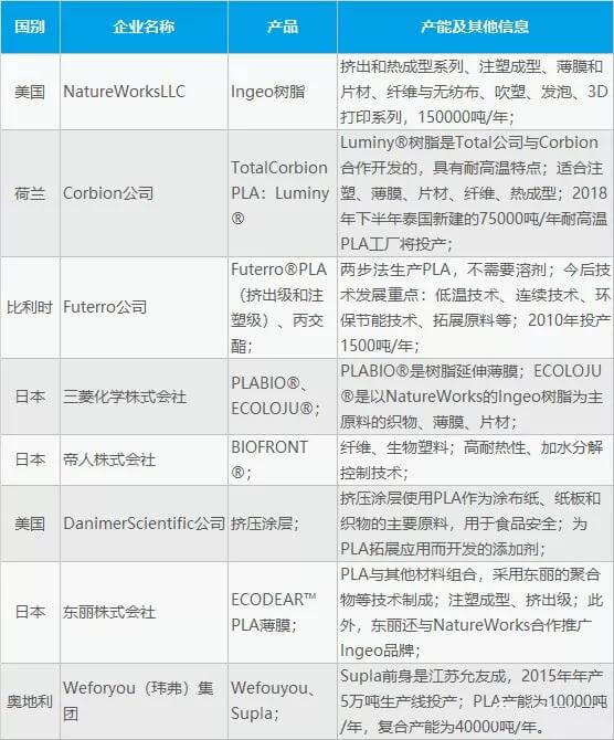 目前,PLA的生产主要集中在美国、中国、德国和日本等国家,如美国的NatrueWorks公司,德国的Inventa-Fischer公司,日本的UNTTKA、帝人、三井化学等公司。