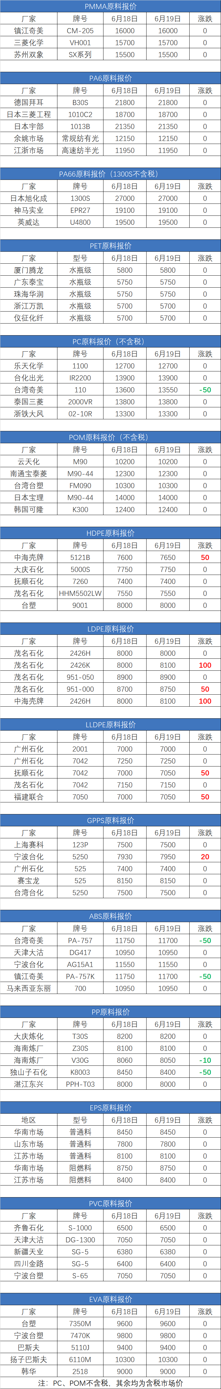 2020年6月19日塑胶原料实时报价