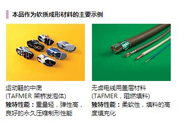 日本三井POE聚烯烃弹性体TAFMER树脂 TAFMER -烯烃共聚物 TAFMER 是本公司采用独有聚合技术开发的非结晶性或低结晶性烯烃共聚物。 柔软性 轻量 低温密封性 耐冲击性 易剥离性 热收缩性 透