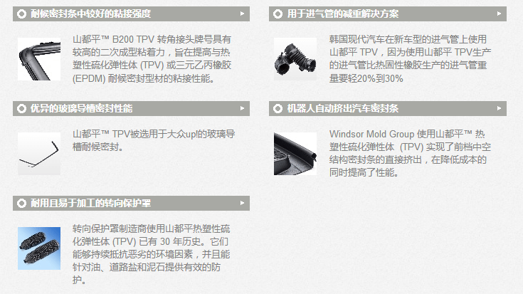 为获得持久的密封性能、卓越的物理特性以及精美的成品外观,设计师和工程师会选用山都平™ 热塑性硫化弹性体 (TPV)。由山都平 TPV 制成的部件具有坚固、韧性佳及外观精美的特点,并可保证部件在使用寿命内具备优异的性能。