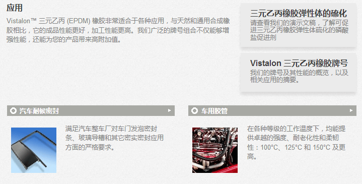 埃克森美孚Vistalon三元乙丙橡胶EPDM橡胶 埃克森美孚化工提供的众多 Vistalon 三元乙丙 (EPDM) 橡胶牌号广泛应用于汽车、消费品和工业等各种应用领域。它们可以提供远超天然橡胶和通用橡